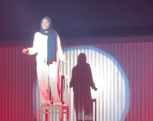 Penampilan dibawakan dengan tata panggung sederhana namun selaras, menggunakan properti berupa kursi kayu dan pencahayaan sorot yang dramatis untuk menonjolkan ekspresi dan gerakan pemeran. Pemeran yang tampil berhasil membangun suasana emosional yang intens, membuat penonton terhanyut hati.